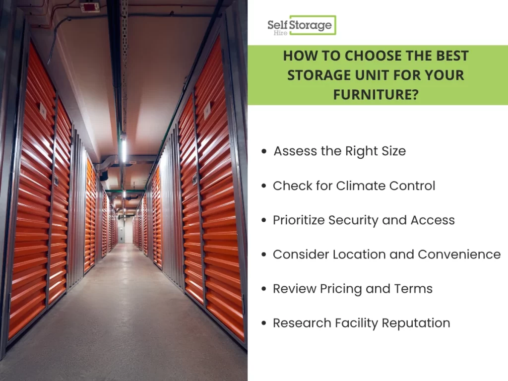 Check reviews, ratings, and testimonials to confirm the self-storage facility’s reliability and quality of service. A reputable storage provider offers peace of mind, professional handling of your furniture, and consistent support if issues arise. This step ensures your belongings remain safe and well-managed.