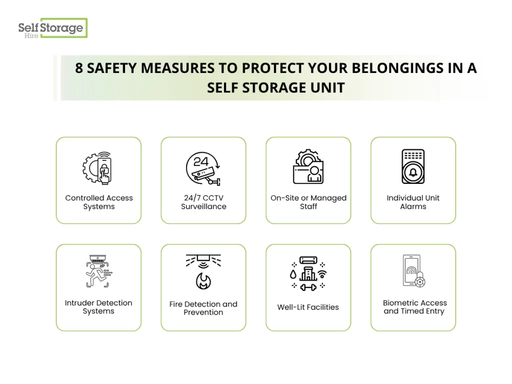 Self-storage facilities install smoke and heat detectors, wireless alarms, sprinklers, and fire-rated compartments to safeguard stored items from fire hazards. When combined with staff training and clear emergency protocols, these systems reduce risk, limit damage, and enable rapid response in critical situations.